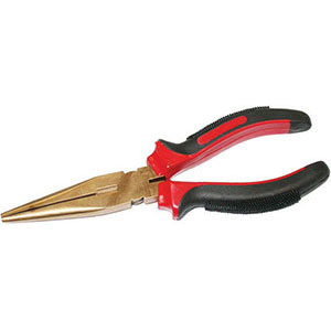 UTENSILI ANTISCINTILLA PINZE A BECCHI MEZZOTONDI DIRITTI CON TRONCHESE PINZE A BECCHI MEZZOTONDI DIRITTI CON TRONCHESE In lega bronzo-alluminio. Impugnature isolate in materiale bicomponente.